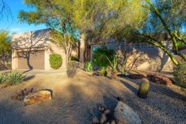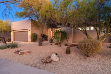 The great room opens to a private backyard oasis with a tranquil fountain, perfect for entertaining or relaxing while enjoying desert sunsets and serene views.