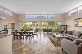Illuminated by an abundance of natural light, this fully furnished single-level home in Canyon Estates spans an impressive 2600 square feet. It encompasses a welcoming Great Room, two generously sized Bedrooms, a spacious Den/Media Room, two Full Baths, a Powder Room, dual central HVAC systems, and an attached 2-car Garage. The Kitchen and Breakfast Room with custom-made wooden cabinets, tiled floors, a Gas cooktop, and granite countertops. The Master en suite, a pivotal feature, boasts dual sinks, a dressing vanity, a walk-in closet, a step-in shower, and an indulgent oversized detached tub.