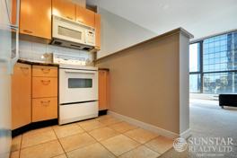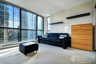 FEATURES: North facing studio unit with full in-suite appliances and open concept floor plan. Carpeted comfort throughout the living area and store-room/office and ceramic tile in the entry, kitchen, and full 4 piece bathroom. Floor to ceiling windows and open concept living/kitchen with breakfast counter give this studio a large feel from the 7th storey. Primarily north facing view with mountains and neighbouring buildings. Some west facing view down West Georgia street. Sorry, no pets and absolutely No Smoking. Unfurnished.