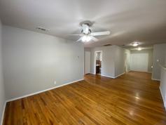 This property features hardwood floors, three bedrooms, and two full bathrooms. The kitchen includes a breakfast bar and countertops. There is an interior laundry room. The master bedroom is spacious with a large walk-in closet. A covered carport is present with stained concrete at the back driveway, along with an attached storage room. The yard is fenced and includes mature trees, offering shade during the summer months.