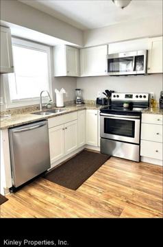 Kitchen with granite counters, stainless steel appliances including smooth top range, dishwasher, microwave & refrigerator.