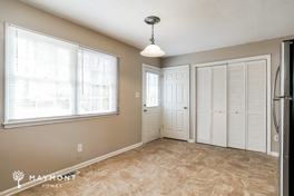 The inviting layout unfolds with a naturally lit living area that connects seamlessly to the kitchen and dining space. The kitchen features dark cabinetry, stainless-steel appliances, and durable tile flooring, creating a practical space for everyday meals. The dining nook sits just off the kitchen, offering views of the backyard through large windows that bring in soft daylight.