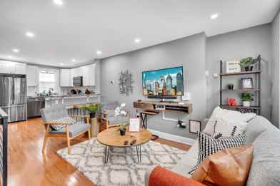 The house is on a one-way residential street in a blue-collar, working-class multicultural neighborhood within South Philadelphia. The home is furnished with a mid-century modern (MCM) style that is inviting and homely and has three bedrooms and 1.5 bathrooms, a finished basement with a laundry room and the family room, and a backyard patio with outdoor seating. Look through the photo gallery for the floor plan.