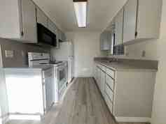 The kitchen offers efficiency and functionality with a dual-sided layout and a walkway between the two prep areas. One side includes an electric oven, mounted microwave, and spacious refrigerator, while the opposite side features a dishwasher and a single-basin stainless steel sink positioned under a bright window. Cabinets and drawers line both sides, providing ample storage. Just beyond the kitchen is a dedicated dining area with a window that brings in natural light and offers plenty of space for hosting meals and gatherings.