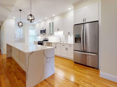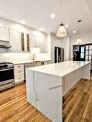 Truly one of a kind! This stunning floor-through home offers an expansive layout with over 2,400 sq. ft. of living space. The completely renovated kitchen boasts quartz countertops, a dramatic ten-foot waterfall island, and sleek stainless steel appliances perfect for both cooking and entertaining.