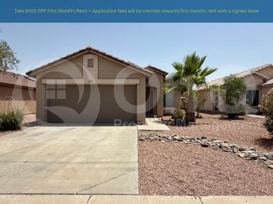 Located in the heart of Surprise, this charming single-story home offers 3 bedrooms, 2 bathrooms, and 1,311 sq ft of living space on a 5,175 sq ft lot. The spacious layout features a bright living room, designated dining area, and an open kitchen with a breakfast bar. Enjoy the convenience of ceiling fans throughout, a walk-in closet in the primary suite, and a dedicated laundry room with washer and dryer included. Step outside to a private fenced yard with a covered patio—perfect for relaxing or entertaining. The 2-car garage includes a garage door opener, and the home is equipped with central A/c (refrigeration) for year-round comfort. Situated in an Hoa community with access to a pool, parks, playgrounds, and walking trails.