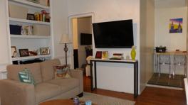 True split 2 bedroom apt with large living room, and spacious Eat in Kitchen. Both bedrooms fit queen beds and furniture. Cozy living room, can fit full living room set and is central common space featuring beautiful built in bookshelves. Huge kitchen with room for table and lots of counter space and cabinets.