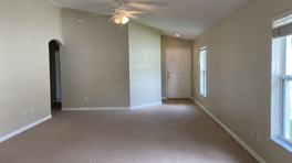 As you enter through the front door you will walk into a very spacious open living/dining room. The home is a split floor plan with 3 bedrooms and a guest bath at the front. The primary suite is located at the back of the house, with a view to the backyard. The flooring throughout the home is freshly cleaned carpet, and ceramic tile within the kitchen and the bathrooms. The kitchen is open and bright with sliding doors opening to the backyard. Perfect for entertaining! High ceilings throughout add to the spacious feeling!