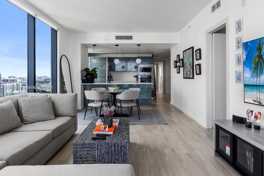 3 Bedroom 2 & 1/2 Bath SE corner line at Icon Bay. 90 day minimum. Flow through layout with East & West balconies. Spectacular sunrise and sunset City and Bay views. Floor to ceiling windows, custom walk-in closets. Private elevator foyer entry. Bayfront swimming pool, Tennis Courts, Gym, Spa, Party Room and entertainment areas including a movie and a pool table.