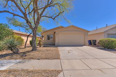Welcome home to this inviting Rita Ranch 4 bedroom, 2 bath home featuring a bright and open kitchen with pantry and ample cabinet and countertop space, perfect for everyday living and entertaining. Brand new LVP flooring was just installed throughout the home! Ceiling fans and window coverings add comfort and functionality. The spacious family room showcases soaring cathedral ceilings and a sliding glass door leading to the patio, creating an airy, open feel with great natural light. Double doors open to a versatile fourth bedroom that works beautifully as a den, playroom, or flex space. The primary suite offers a relaxing retreat with a walk-in closet and dual vanity sinks. Separate laundry room with extra storage keeps everything organized. Step outside to a low-care backyard perfect for relaxing evenings or weekend gatherings.