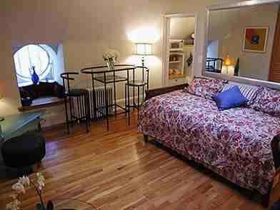 Charming studio on top floor of the historic Ansonia. Porthole windows, skylight, and central A/C. Huge walk-in closet and built-ins. Separate kitchen. Tastefully furnished. Available May 9th for 6-24 months