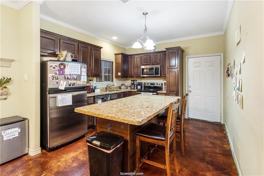 The layout includes two bedrooms and one full bath with double vanity downstairs, along with the laundry area. Upstairs offers two private bedrooms, each with its own en-suite bathroom. Walk-in closets and ample bathroom counter space provide added convenience. Washer, dryer, and refrigerator are included. The property offers rear parking and a fenced side yard suitable for storage or outdoor use. Convenient to major thoroughfares, retail, dining, and Texas A&M University.