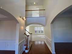 A two-story foyer welcomes you into elegant, formal living and dining rooms adorned with hardwood floors, trey ceilings and soft archways. The kitchen and bathrooms feature updated light fixtures and tiled flooring. Your open plan family room and eat-in kitchen offer a cozy fireplace and a sunny, bay-windowed breakfast area. The kitchen is upgraded with a lovely tile backsplash, a built-in desk, a breakfast bar and a pantry. A bedroom and full bath round out the main level, perfect for guests!