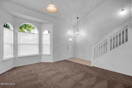 Step into comfort and style with this charming 3-bedroom, 2-bathroom home in East El Paso! Featuring refrigerated A/C and window blinds throughout, this home ensures year-round comfort. The spacious kitchen offers a center island and a cozy breakfast area, perfect for daily dining. The inviting living room comes complete with a fireplace and a built-in media wall, providing a great space for relaxing and entertaining. Upstairs, you'll find three carpeted bedrooms, including a master suite, all filled with plenty of natural lighting. Tile flooring adds a sleek touch to the main living areas, while washer/dryer hookups offer everyday convenience. The landscaped front and back yards provide a lovely outdoor escape, and the double car garage offers ample storage and parking. With easy access to Loop 375, this home offers the perfect combination of convenience and modern living in East El Paso. Don't miss out on this opportunity!