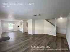 Upstairs, the primary bedroom offers a walk-in closet and a private bathroom with a tiled walk-in shower. Two additional bedrooms share a full bathroom with a combination tub and shower. All bedrooms feature durable laminate flooring, providing a clean and cohesive look throughout. A laundry area with a full-size washer and dryer is also located upstairs for added convenience.