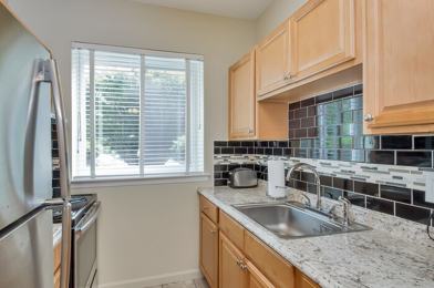 This gorgeous 680 spacious square foot home features new kitchen cabinets, new counters, a custom black/white/silver tiled back splash, stainless steel appliances (frost-free fridge/freezer & oven/range), garbage disposal, air conditioning, a ceiling fan in the dining area, custom fit blinds, new doors throughout, new closet shelving, a closet organizer in the master bedroom closet, more than ample closet space, a remodeled bathroom and brushed nickel fixtures and finishes.