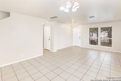 This spacious two-story home in the Champions Park subdivision is freshly painted and ready for move-in. The first floor features a formal living and dining area with ceramic tile, offering plenty of space for entertaining or family gatherings. The kitchen includes a center island, ample cabinet storage, and a large walk-in pantry, making meal prep easy and organized. Upstairs, brand-new carpeting flows throughout a generous family room-perfect for movie or game nights. The laundry room is conveniently located on the second floor. The primary suite features a recessed ceiling with crown molding, a ceiling fan, and a cozy sitting area ideal for reading or a home office. The ensuite bath includes a single vanity, tub/shower combo, and a spacious walk-in closet. Step outside to a private backyard with a patio slab and full privacy fence, perfect for relaxing or hosting friends. Conveniently located near Lackland Air Force Base, major highways, Northwest Vista College, SeaWorld, shopping, and dining.