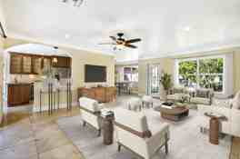 Lagoon & cove views enhance this inviting residence featuring a private backyard framed by thick hedge fencing and no carpeting throughout. The living room, kitchen, and primary suite all overlook the serene rear view, while three sets of double French doors open to a spacious screened pool and patio, ideal for seamless indoor-outdoor living. The kitchen offers abundant cabinetry, including a peninsula, pantry, and snack bar, along with granite countertops and stainless steel appliances. A split-bedroom floor plan provides privacy, and the cabana bath offers convenient access to the pool area. The laundry room includes a utility tub and built-in cabinets for added functionality. Roof 2013 | A/C 2020 | Tankless water heater 2024Freshly painted, exceptionally clean, and move-in ready.
