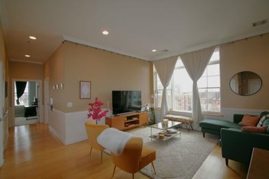 Beautiful Soleil Lofts penthouse home with two garage parking spots, just minutes from vibrant Jersey City's many cultural activities, superb dining, nightlife, shopping and lovely parks. This expansive sun-drenched two-bed, two-bath with over-sized windows features a large modern kitchen with granite counter tops, limestone back splash, stainless steel appliances and rich cabinetry that's open to spacious living/dining area. Perfect for entertaining family and friends or just relaxing in your urban retreat. Sizeable bedrooms including primary that easily accommodates a king-size bed and offers the convenience of an en-suite, and tasteful contemporary baths with granite vanity and limestone flooring. High ceilings, recessed lighting, crown molding, hardwood flooring, abundant storage, central air and in-unit washer/dryer complete this splendid home. Bus to Manhattan at the corner or short distance to PATH.