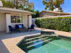 Your seasonal vacation awaits in this Palm Desert C.C. pool home featuring amazing views! This private home features 3 bedrooms, 2 bath and has been tastefully furnished for your enjoyment. Take a dip in the private pool and spa located in an enclosed front courtyard. Back patio is covered and offers spectacular views as you sit back and relax or entertain with the dining area and living area opening to the patio. Ceiling fans, carpet in bedrooms, nice bright and ultra clean house! Palm Desert C.C. is located close to everything and only a short drive El Paseo, shopping, restaurants, golf and much more! This is the perfect home to come relax!