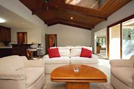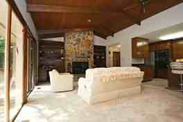 This spacious 2,004 sqft one-level home offers a thoughtful layout and an inviting atmosphere. The heart of the home is an open-concept living and dining area, featuring a vaulted wood ceiling with skylights, a floor-to-ceiling stone fireplace, and built-in shelving. This central space flows seamlessly into the kitchen, a bright sunroom, and a home office with French doors.