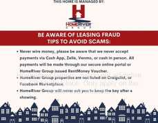HomeRiver Group does not advertise properties on, LetGo, or other classified ad websites. If you suspect one of our properties has been fraudulently listed on these platforms, please notify HomeRiver Group immediately. We never accept wire transfers or payments via Zelle, PayPal, or Cash App. Lease your home safely through www Homeriver com or with the assistance of a licensed HomeRiver Group leasing agent. All leasing information contained herein is deemed accurate but not guaranteed. Please note that changes may have occurred since the photographs were taken. Square footage is estimated.