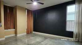 A clear, open footprint allows for flexible furniture placement, whether setting up a media area, arranging seating, or carving out a work-from-home spot. A ceiling fan supports air circulation, while the balcony provides an outdoor option for fresh air or a small seating setup.