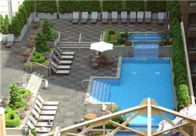 Landscaped, 7th floor rooftop area with outdoor pool, whirlpool spa, kiddy pool, sundeck with lounge chairs, and spectacular view of the city skyline