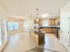 Upon entry, you’re welcomed by a tiled foyer opening into a spacious living area with LVP flooring and an elegant tray ceiling. The living room flows seamlessly into the kitchen and eat-in dining area, creating an ideal layout for entertaining. The spacious kitchen boasts ample cabinet and counter space, a dual-basin undermount sink overlooking the backyard, a large island, and stainless steel appliances including a double-door refrigerator, flat-top range/oven, built-in microwave, and dishwasher.