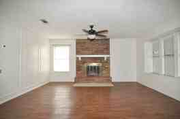 Spacious 16x14 living room with luxury vinyl plank flooring and a floor-to-ceiling woodburning brick fireplace. The kitchen features white cabinets, electric appliances, and a charming half-brick accent wall, plus a separate breakfast area with tile floors and decorative wainscoting.