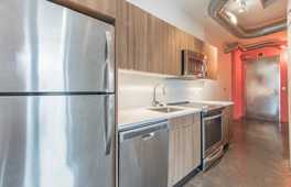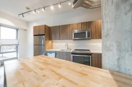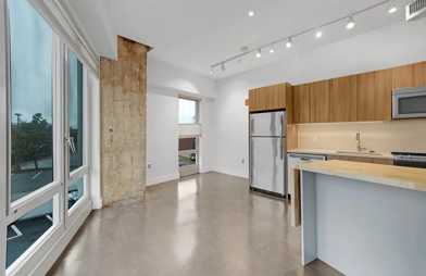 Inside, the open-concept layout creates a versatile living space perfect for everyday living and entertaining. Floor-to-ceiling windows flood the unit with natural light, highlighting the modern finishes and exposed concrete features. The well-appointed kitchen boasts quartz countertops, stainless-steel appliances, and rich wood cabinetry balancing both function and style. The adjacent living area accommodates lounging, dining, and even a dedicated home office nook.