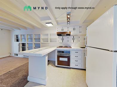 - Kitchen includes electric range/oven and refrigerator