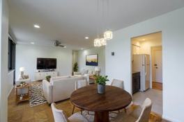 Spacious, open living and dining space with lovely mid-century-style wood parquet floors. Plenty of room for all kinds of living and dining arrangements. Sizable, efficient galley kitchen with tons of cabinet storage. Large bedroom featuring lots of natural light. Private deck that makes the perfect spot to dine outdoors or relax in good weather.