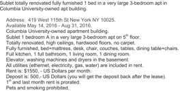 Sublet totally renovated fully furnished 1 bed in a very large 3-bedroom apt in Columbia University-owned apt building. Address: 419 West 115th St New York NY 10025. Available May 14, 2016 - Aug 31, 2016. Columbia University-owned apartment building. Sublet 1 bedroom A in a very large 3-bedroom apt on 5th floor. Totally renovated, high ceilings, hardwood floors, no carpet. Fully furnished, bed+mattress, desk, chair, couches, tables, dining table+chairs. Full kitchen, 1 full bathroom, 1 living room, 1 dining room. Elevator, washing machines and dryers in the basement. All utilities (ethernet, electricity, gas, water) are included in rent. Rent is: $1550, - US Dollars per month. Deposit is: 500,- US Dollars (you will get the deposit back after the lease). 1st and last month rent is prorated. Pets and smoking prohibited.