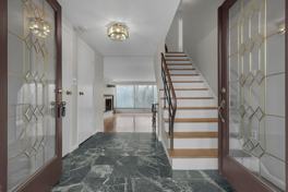 Upstairs, you’ll find two large bedroom suites, each with private en-suite baths and enormous walk-in closets. Two separate staircases lead to the finished lower level, which includes a generous recreation room and full bath. A secondary stairwell provides direct access to the laundry area and garage for added convenience.