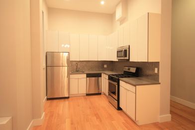 The apartment is gut renovated. Stainless steel appliances, wood cabinets, grant-countertops. Microwave, dishwasher and plenty of counter space. Apartment features, high ceilings, recessed lighting, hardwood floors, freshly painted, very large bedrooms and ample closet space.