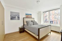 Rare opportunity! South facing 1 bedroom,1 bath apartment in a boutique, full service doorman building in the heart of the East Village. The spacious light filled living room has floor to ceiling double insulated windows and a balcony. The open kitchen features porcelain tile floors, quartzite countertops, stainless steel Liebherr refrigerator, Bosch appliances including in unit washer/dryer. The king sized master bedroom has a large closet and plenty of room for dressers and vanity's. The bathroom has been beautifully designed with white glass stone walls, heated porcelain floor tile and a marble topped vanity. Village Green is the first LEED Gold certified building in the East Village. The building features a highly efficient Daikin central heating and air conditioning system. Common areas include Wellness Center with gym, sauna and residence's lounge. Situated moments from most major subway lines, Union Square, Tompkins Square Park and endless restaurants cafes and entertainment. Have it all in one Manhattan's most stylish post-war condominiums. NO PETS