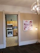 This large one-bedroom apartment is on the first floor of a Victorian 5-plex near Lake Merritt. High ceilings throughout, with natural light in each room, and lots of original Victorian trimwork. The full-size eat-in kitchen has ample cabinet storage, a gas oven/cooktop and a double bowl deep stainless steel sink for the cook. The living room is updated with recyclable mid-century inspired carpet squares. The carpeted bedroom has a large walk-in closet with shelves/organizer and a nook with window (for an aspiring writer?). The bathroom has a tiled shower (no bathtub).