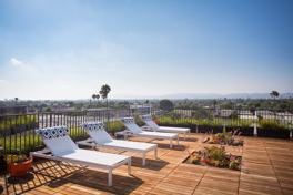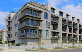This 29-unit contemporary building reflects the creative energy and local artistic spirit of Venice. A custom-fabricated garage gate features vertical Redwood applicate planks on steel, providing both beauty and security, while impressive, angled poured-in-place concrete planters showcase gorgeous, low-water succulents adding color and vibrancy.