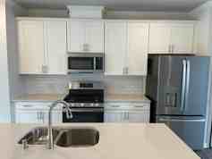 Kitchen includes white cabinets, light gray quartz countertops, walk-in pantry, and stainless steel appliances