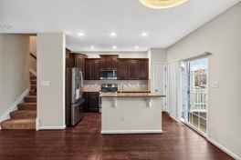 An elegant open-concept kitchen boasting rich espresso-stained cabinetry for abundant storage, sleek stainless steel appliances, granite countertops, and a spacious French-door refrigerator—perfect for both cooking and entertaining.