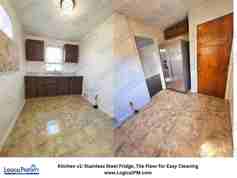 Just beyond the dining area is the updated kitchen, featuring rich espresso cabinetry, modern finishes, and a stainless steel refrigerator. The kitchen is designed with functionality in mind, providing ample storage and workspace to make cooking and cleanup easy and efficient.