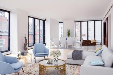 The interiors have been thoughtfully designed by Thomas Juul-Hansen. Apt 6B is a corner 3 bed, 3,5 Bath, with 3 exposures, incredible natural light, and open SOHO VIEWS. Other highlights include: Wide-plank solid oak floors throughout contrast beautifully with a multitude of fully operable floor-to-ceiling, French door style windows. The handcrafted kitchen cabinetry by Smallbone of Devizes continues that same ethos of quality and warmth and are complemented with marble countertops, Wolf cooking appliances including double ovens and warming drawer, Sub-Zero refrigerators, and Miele dishwashers. Spectacularly scaled master suites come complete with a sumptuous master bathrooms containing marble slab floors and walls, bleached zebrawood cabinetry, Toto Neorest toilets, Lefroy Brooks fixtures, and double rain-shower heads with steam-showers. Additional luxury is provided by expandable, smart-home technology that controls lighting, HVAC and window treatments.