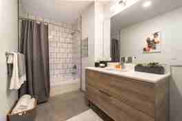 • Spa-like bathrooms featuring European quartz custom vanities with 42″ mirrors