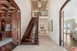 This gated French Country Maison offers 4 bedrooms, 2 staff quarters, 9 baths and gorgeous city views. A long private driveway framed by mature olive trees, white roses & lavender leads to a large motor court. 2-story entry, library, coffered ceilings, and French doors overlook the courtyard. Formal living rm w/views from downtown to Century City on approximately 2 acres. California indoor/outdoor lifestyle w/spacious dining room, gourmet chef's kitchen & breakfast area w/ family room. Lovely verandas, terraces, outdoor BBQ w/fireplace, salt water pool and a pergola. The luxurious primary suite has 2 separate baths & 2 walk-in closets. Open media room, game room, service kitchen, N/S championship Tennis Court, gym, sauna & attached 3-car garage. Furnished only.