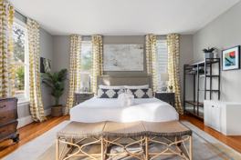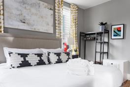 You will enter through the front door into the kitchen which features stainless steel appliances, a small dining area for two, and is fully stocked with all of your cooking and dining essentials. Just off of the kitchen is the beautiful Master Bedroom. The high ceilings, floor to ceiling windows, and plush King bed make this space the ultimate luxurious escape. There is also a desk and chair to accommodate all of your work from home needs. There is a full bathroom just off of the Master Bedroom and kitchen which features a beautiful tile shower.