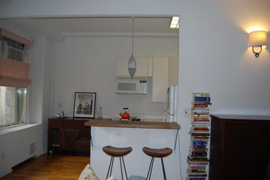 This apartment features 10 foot beamed ceilings and hardwood floors. Three oversized north facing windows with lined shades that allow you to lower and raise at both ends for optimal lighting of your choosing.