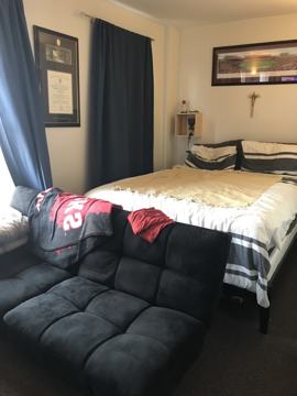 Large, bright South End studio with wall-to-wall carpeting. Nice galley kitchen with half-size fridge and two stove top burners. Cat okay. Laundry in building. Non-Smoking. Quiet, well-kept building.