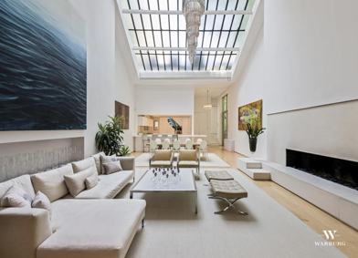After passing through a grand old-world entryway off an exceptionally high and elegant stoop you are soon transported into a modern space with double height ceilings that crest at over 20 feet, all bathed in light from 400 square feet of skylights. The triplex plus finished basement (which includes a screening room and storage) has 4 to 5 bedrooms and 5 1/2 baths. From the huge loft-like ground floor floating walnut stairs lead you to the basement that features original brick arches and exposed wood beams. The stunning parlor and third floors boast original plaster ceilings and moldings. In addition to the back garden there are two other outdoor areas: a front garden with a deep storage area under the stoop and a terrace off the 3rd floor.
