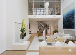 The upper unit of this townhouse is flooded with light from large windows and multiple skylights. It features a home office, 3 bathrooms, 3 bathrooms, all spread out on 2 chic floors. This residence is accessed by walking up the elegant central stairwell of the townhouse. A beautiful kitchen, washer/dryer, spiral staircase, and designer finishes await you in this special home.